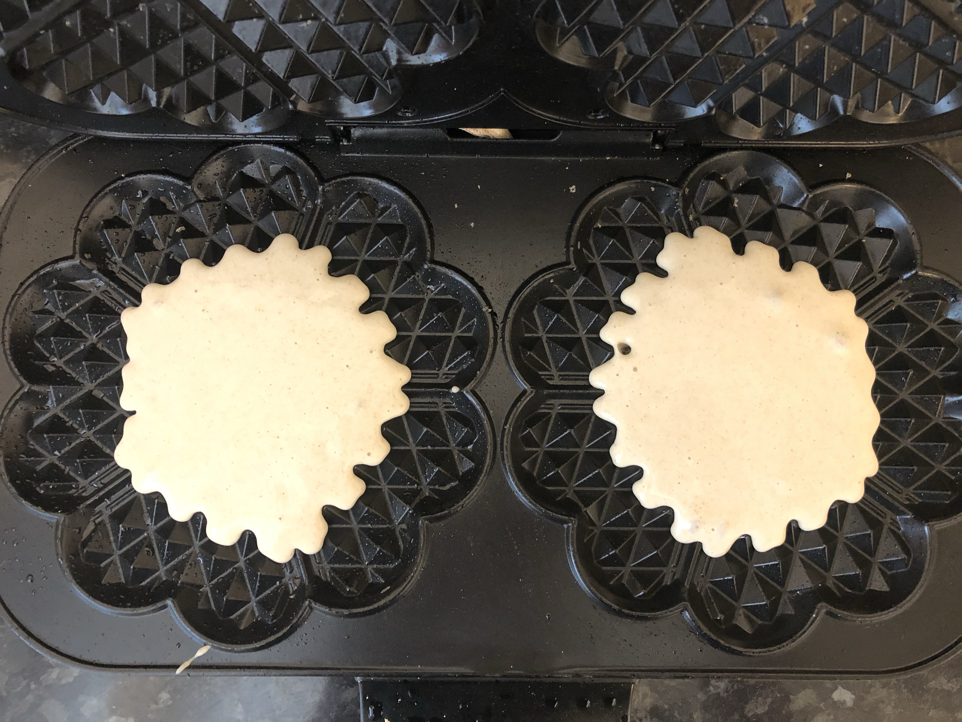 Brush your iron with a teeny bit of oil and pour the mixture onto the iron. Be careful not to overfill it.